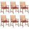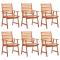 Chaises à manger d'extérieur lot de 6 et coussins Acacia massifCet ensemble de chaises de salle à manger contemporain en bois avec coussins ajoutera une touche de style naturel à votre jardin, terrasse ou patio. Cet ensemble de chaises en bois sera un excellent choix pour les repas en plein air. Ces chaises de jardin sont fabriquées en bois d'acacia massif, un bois dur tropical, résistant aux intempéries et durable pendant des années. La surface finie à l'huile est facile à nettoyer avec un chiffon humide. La conception à lattes apportera un charme rustique. De plus, les coussins inclus offrent du confort supplémentaire lors de l'assise. Il est composé à 100 % de polyester qui a été traité pour le rendre imperméable. Chaque coussin a deux jeux de cordes pour le fixer fermement sur la chaise. Remarque : Afin de prolonger la durée de vie de vos meubles d'extérieur, nous vous recommandons de les nettoyer régulièrement et de ne pas les laisser à l'extérieur sans protection inutilement. Nettoyage : Utiliser une solution savonneuse douce Stockage : Si possible, stockez dans un endroit frais et sec à l'intérieur. Si le produit est stocké à l'extérieur, protégez-le avec une housse imperméable. Essuyez et séchez l'excès d'eau ou de neige des surfaces planes après la pluie ou une chute de neige. Permettez une circulation d'air suffisante afin d'éviter les dommages liés à l'humidité. Maximum 110 kg par siège.