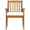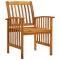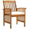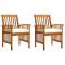 Chaises à manger de jardin lot de 2 et coussins acacia massifAsseyez-vous pour un dîner en plein air ou détendez-vous et profitez du beau temps sur ces chaises en bois de salle à manger de jardin. Ces chaises de jardin sont fabriquées en bois d'acacia massif, un bois dur tropical, résistant aux intempéries et durable. La surface finie à l'huile est facile à nettoyer avec un chiffon humide. La conception à lattes apportera un charme rustique. De plus, les coussins inclus offrent du confort supplémentaire lors de l'assise. Remarque: Afin de prolonger la durée de vie de vos meubles d'extérieur, nous vous recommandons de les nettoyer régulièrement et de ne pas les laisser à l'extérieur sans protection inutilement.Nettoyage: Utiliser une solution savonneuse douce.Stockage: Si possible, stockez dans un endroit frais et sec à l'intérieur. Si le produit est stocké à l'extérieur, protégez-le avec une housse imperméable. Essuyez et séchez l'excès d'eau ou de neige des surfaces planes après la pluie ou une chute de neige. Permettez une circulation d'air suffisante afin d'éviter les dommages liés à l'humidité.
