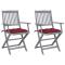 Chaises pliables d'extérieur lot de 2 et coussins Bois d'acaciaCet ensemble de chaises de salle à manger en bois contemporain avec coussins ajoute une touche de style naturel à votre jardin, terrasse ou patio. Cet ensemble de chaises pliables est un excellent choix pour les repas. Ces chaises de salle à manger sont faites de bois d'acacia massif, un bois dur tropical, les rendant résistantes aux intempéries et durables pour des années d'utilisation. Le bois d'acacia massif a la force de soutenir le poids et de résister à l'usure du temps. La surface grise délavée est facile à nettoyer avec un chiffon humide. Les chaises peuvent être repliées pour économiser de l'espace lorsqu'elles ne sont pas utilisées. De plus, les coussins inclus offrent un confort supplémentaire lors des moments de détente ou des repas. Chaque coussin comporte deux ensembles de cordes pour le fixer fermement à la chaise. Maximum 110 kg par siège.