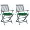 Chaises pliables d'extérieur lot de 2 et coussins Bois d'acaciaCet ensemble de chaises de salle à manger en bois contemporain avec coussins ajoute une touche de style naturel à votre jardin, terrasse ou patio. Cet ensemble de chaises pliables est un excellent choix pour les repas. Ces chaises de salle à manger sont faites de bois d'acacia massif, un bois dur tropical, les rendant résistantes aux intempéries et durables pour des années d'utilisation. Le bois d'acacia massif a la force de soutenir le poids et de résister à l'usure du temps. La surface grise délavée est facile à nettoyer avec un chiffon humide. Les chaises peuvent être repliées pour économiser de l'espace lorsqu'elles ne sont pas utilisées. De plus, les coussins inclus offrent un confort supplémentaire lors des moments de détente ou des repas. Chaque coussin comporte deux ensembles de cordes pour le fixer fermement à la chaise. Maximum 110 kg par siège.
