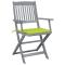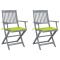 Chaises pliables d'extérieur lot de 2 et coussins Bois d'acaciaCet ensemble de chaises de salle à manger en bois contemporain avec coussins ajoute une touche de style naturel à votre jardin, terrasse ou patio. Cet ensemble de chaises pliables est un excellent choix pour les repas. Ces chaises de salle à manger sont faites de bois d'acacia massif, un bois dur tropical, les rendant résistantes aux intempéries et durables pour des années d'utilisation. Le bois d'acacia massif a la force de soutenir le poids et de résister à l'usure du temps. La surface grise délavée est facile à nettoyer avec un chiffon humide. Les chaises peuvent être repliées pour économiser de l'espace lorsqu'elles ne sont pas utilisées. De plus, les coussins inclus offrent un confort supplémentaire lors des moments de détente ou des repas. Chaque coussin comporte deux ensembles de cordes pour le fixer fermement à la chaise. Maximum 110 kg par siège.