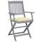 Chaises pliables d'extérieur lot de 4 et coussins Bois d'acaciaCet ensemble de chaises de salle à manger en bois contemporain avec coussins ajoute une touche de style naturel à votre jardin, terrasse ou patio. Cet ensemble de chaises pliables est un excellent choix pour les repas. Ces chaises de salle à manger sont faites de bois d'acacia massif, un bois dur tropical, les rendant résistantes aux intempéries et durables pour des années d'utilisation. Le bois d'acacia massif a la force de soutenir le poids et de résister à l'usure du temps. La surface grise délavée est facile à nettoyer avec un chiffon humide. Les chaises peuvent être repliées pour économiser de l'espace lorsqu'elles ne sont pas utilisées. De plus, les coussins inclus offrent un confort supplémentaire lors des moments de détente ou des repas. Chaque coussin comporte deux ensembles de cordes pour le fixer fermement à la chaise. Maximum 110 kg par siège. ,