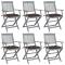 Chaises pliables d'extérieur lot de 6 et coussins Bois d'acaciaCet ensemble de chaises de salle à manger en bois contemporain avec coussins ajoute une touche de style naturel à votre jardin, terrasse ou patio. Cet ensemble de chaises pliables est un excellent choix pour les repas. Ces chaises de salle à manger sont faites de bois d'acacia massif, un bois dur tropical, les rendant résistantes aux intempéries et durables pour des années d'utilisation. Le bois d'acacia massif a la force de soutenir le poids et de résister à l'usure du temps. La surface grise délavée est facile à nettoyer avec un chiffon humide. Les chaises peuvent être repliées pour économiser de l'espace lorsqu'elles ne sont pas utilisées. De plus, les coussins inclus offrent un confort supplémentaire lors des moments de détente ou des repas. Chaque coussin comporte deux ensembles de cordes pour le fixer fermement à la chaise. Maximum 110 kg par siège.