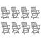 Chaises pliables d'extérieur lot de 8 et coussins Bois d'acaciaCet ensemble de chaises de salle à manger en bois contemporain avec coussins ajoute une touche de style naturel à votre jardin, terrasse ou patio. Cet ensemble de chaises pliables est un excellent choix pour les repas. Ces chaises de salle à manger sont faites de bois d'acacia massif, un bois dur tropical, les rendant résistantes aux intempéries et durables pour des années d'utilisation. Le bois d'acacia massif a la force de soutenir le poids et de résister à l'usure du temps. La surface grise délavée est facile à nettoyer avec un chiffon humide. Les chaises peuvent être repliées pour économiser de l'espace lorsqu'elles ne sont pas utilisées. De plus, les coussins inclus offrent un confort supplémentaire lors des moments de détente ou des repas. Chaque coussin comporte deux ensembles de cordes pour le fixer fermement à la chaise. Remarque : Afin de prolonger la durée de vie de vos meubles d'extérieur, nous vous recommandons de les nettoyer régulièrement et de ne pas les laisser à l'extérieur sans protection inutilement.Nettoyage : Utiliser une solution savonneuse douceStockage : Si possible, stockez dans un endroit frais et sec à l'intérieur. Si le produit est stocké à l'extérieur, protégez-le avec une housse imperméable. Essuyez et séchez l'excès d'eau ou de neige des surfaces planes après la pluie ou une chute de neige. Permettez une circulation d'air suffisante afin d'éviter les dommages liés à l'humidité. Maximum 110 kg par siège.