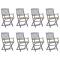 Chaises pliables d'extérieur lot de 8 et coussins Bois d'acaciaCet ensemble de chaises de salle à manger en bois contemporain avec coussins ajoute une touche de style naturel à votre jardin, terrasse ou patio. Cet ensemble de chaises pliables est un excellent choix pour les repas. Ces chaises de salle à manger sont faites de bois d'acacia massif, un bois dur tropical, les rendant résistantes aux intempéries et durables pour des années d'utilisation. Le bois d'acacia massif a la force de soutenir le poids et de résister à l'usure du temps. La surface grise délavée est facile à nettoyer avec un chiffon humide. Les chaises peuvent être repliées pour économiser de l'espace lorsqu'elles ne sont pas utilisées. De plus, les coussins inclus offrent un confort supplémentaire lors des moments de détente ou des repas. Chaque coussin comporte deux ensembles de cordes pour le fixer fermement à la chaise. Remarque : Afin de prolonger la durée de vie de vos meubles d'extérieur, nous vous recommandons de les nettoyer régulièrement et de ne pas les laisser à l'extérieur sans protection inutilement.Nettoyage : Utiliser une solution savonneuse douceStockage : Si possible, stockez dans un endroit frais et sec à l'intérieur. Si le produit est stocké à l'extérieur, protégez-le avec une housse imperméable. Essuyez et séchez l'excès d'eau ou de neige des surfaces planes après la pluie ou une chute de neige. Permettez une circulation d'air suffisante afin d'éviter les dommages liés à l'humidité. Maximum 110 kg par siège.