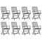 Chaises pliables d'extérieur lot de 8 et coussins Bois d'acaciaCet ensemble de chaises de salle à manger en bois contemporain avec coussins ajoute une touche de style naturel à votre jardin, terrasse ou patio. Cet ensemble de chaises pliables est un excellent choix pour les repas. Ces chaises de salle à manger sont faites de bois d'acacia massif, un bois dur tropical, les rendant résistantes aux intempéries et durables pour des années d'utilisation. Le bois d'acacia massif a la force de soutenir le poids et de résister à l'usure du temps. La surface grise délavée est facile à nettoyer avec un chiffon humide. Les chaises peuvent être repliées pour économiser de l'espace lorsqu'elles ne sont pas utilisées. De plus, les coussins inclus offrent un confort supplémentaire lors des moments de détente ou des repas. Chaque coussin comporte deux ensembles de cordes pour le fixer fermement à la chaise. Remarque : Afin de prolonger la durée de vie de vos meubles d'extérieur, nous vous recommandons de les nettoyer régulièrement et de ne pas les laisser à l'extérieur sans protection inutilement. Nettoyage : Utiliser une solution savonneuse douce Stockage : Si possible, stockez dans un endroit frais et sec à l'intérieur. Si le produit est stocké à l'extérieur, protégez-le avec une housse imperméable. Essuyez et séchez l'excès d'eau ou de neige des surfaces planes après la pluie ou une chute de neige. Permettez une circulation d'air suffisante afin d'éviter les dommages liés à l'humidité. Maximum 110 kg par siège. ,