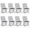 Chaises pliables d'extérieur lot de 8 et coussins Bois d'acaciaCet ensemble de chaises de salle à manger en bois contemporain avec coussins ajoute une touche de style naturel à votre jardin, terrasse ou patio. Cet ensemble de chaises pliables est un excellent choix pour les repas. Ces chaises de salle à manger sont faites de bois d'acacia massif, un bois dur tropical, les rendant résistantes aux intempéries et durables pour des années d'utilisation. Le bois d'acacia massif a la force de soutenir le poids et de résister à l'usure du temps. La surface grise délavée est facile à nettoyer avec un chiffon humide. Les chaises peuvent être repliées pour économiser de l'espace lorsqu'elles ne sont pas utilisées. De plus, les coussins inclus offrent un confort supplémentaire lors des moments de détente ou des repas. Chaque coussin comporte deux ensembles de cordes pour le fixer fermement à la chaise. Remarque : Afin de prolonger la durée de vie de vos meubles d'extérieur, nous vous recommandons de les nettoyer régulièrement et de ne pas les laisser à l'extérieur sans protection inutilement.Nettoyage : Utiliser une solution savonneuse douceStockage : Si possible, stockez dans un endroit frais et sec à l'intérieur. Si le produit est stocké à l'extérieur, protégez-le avec une housse imperméable. Essuyez et séchez l'excès d'eau ou de neige des surfaces planes après la pluie ou une chute de neige. Permettez une circulation d'air suffisante afin d'éviter les dommages liés à l'humidité. Maximum 110 kg par siège.
