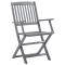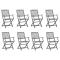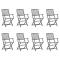 Chaises pliables d'extérieur lot de 8 et coussins Bois d'acaciaCet ensemble de chaises de salle à manger en bois contemporain avec coussins ajoute une touche de style naturel à votre jardin, terrasse ou patio. Cet ensemble de chaises pliables est un excellent choix pour les repas. Ces chaises de salle à manger sont faites de bois d'acacia massif, un bois dur tropical, les rendant résistantes aux intempéries et durables pour des années d'utilisation. Le bois d'acacia massif a la force de soutenir le poids et de résister à l'usure du temps. La surface grise délavée est facile à nettoyer avec un chiffon humide. Les chaises peuvent être repliées pour économiser de l'espace lorsqu'elles ne sont pas utilisées. De plus, les coussins inclus offrent un confort supplémentaire lors des moments de détente ou des repas. Chaque coussin comporte deux ensembles de cordes pour le fixer fermement à la chaise. Remarque : Afin de prolonger la durée de vie de vos meubles d'extérieur, nous vous recommandons de les nettoyer régulièrement et de ne pas les laisser à l'extérieur sans protection inutilement. Nettoyage : Utiliser une solution savonneuse douce Stockage : Si possible, stockez dans un endroit frais et sec à l'intérieur. Si le produit est stocké à l'extérieur, protégez-le avec une housse imperméable. Essuyez et séchez l'excès d'eau ou de neige des surfaces planes après la pluie ou une chute de neige. Permettez une circulation d'air suffisante afin d'éviter les dommages liés à l'humidité. Maximum 110 kg par siège. ,