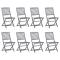 Chaises pliables d'extérieur lot de 8 et coussins Bois d'acaciaCet ensemble de chaises de salle à manger en bois contemporain avec coussins ajoute une touche de style naturel à votre jardin, terrasse ou patio. Cet ensemble de chaises pliables est un excellent choix pour les repas. Ces chaises de salle à manger sont faites de bois d'acacia massif, un bois dur tropical, les rendant résistantes aux intempéries et durables pour des années d'utilisation. Le bois d'acacia massif a la force de soutenir le poids et de résister à l'usure du temps. La surface grise délavée est facile à nettoyer avec un chiffon humide. Les chaises peuvent être repliées pour économiser de l'espace lorsqu'elles ne sont pas utilisées. De plus, les coussins inclus offrent un confort supplémentaire lors des moments de détente ou des repas. Chaque coussin comporte deux ensembles de cordes pour le fixer fermement à la chaise. Remarque : Afin de prolonger la durée de vie de vos meubles d'extérieur, nous vous recommandons de les nettoyer régulièrement et de ne pas les laisser à l'extérieur sans protection inutilement. Nettoyage : Utiliser une solution savonneuse douce Stockage : Si possible, stockez dans un endroit frais et sec à l'intérieur. Si le produit est stocké à l'extérieur, protégez-le avec une housse imperméable. Essuyez et séchez l'excès d'eau ou de neige des surfaces planes après la pluie ou une chute de neige. Permettez une circulation d'air suffisante afin d'éviter les dommages liés à l'humidité. Maximum 110 kg par siège. ,