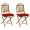 Chaises pliables de jardin lot de 2 avec coussins BambouCet ensemble de 2 chaises de jardin avec coussins sera un excellent choix pour les repas en plein air dans le jardin ou sur la terrasse. Fabriquée en bambou massif, la chaise d'extérieur est résistante et durable. Elle est également résistante aux intempéries et imperméable et facile à nettoyer avec un chiffon humide. La chaise de salle à manger est pliable pour économiser de l'espace de stockage lorsqu'elle n'est pas utilisée. De plus, les coussins fournis offrent du confort supplémentaire lors de la détente. Elle est composée à 100 % de polyester, ce qui la rend résistante et durable pour être adaptée à une utilisation en plein air. Chaque coussin a deux jeux de cordes pour le fixer fermement sur la chaise. Remarque : Afin de prolonger la durée de vie de vos meubles d'extérieur, nous vous recommandons de les nettoyer régulièrement et de ne pas les laisser à l'extérieur sans protection inutilement.Nettoyage : Utiliser une solution savonneuse douceStockage : Si possible, stockez dans un endroit frais et sec à l'intérieur. Si le produit est stocké à l'extérieur, protégez-le avec une housse imperméable. Essuyez et séchez l'excès d'eau ou de neige des surfaces planes après la pluie ou une chute de neige. Permettez une circulation d'air suffisante afin d'éviter les dommages liés à l'humidité. Maximum 110 kg par siège.