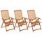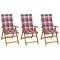 Chaises pliables de jardin lot de 3 avec coussins Bois d'acaciaCet ensemble de chaises de jardin en bois avec coussins est conçu pour ajouter un look vintage à tout dîner dans votre jardin, sur votre terrasse ou patio. La chaise pliable est en bois d'acacia massif, un bois dur tropical, ce qui la rend stable et durable. La surface à finition à huile est facile à nettoyer avec un chiffon humide. La chaise de salle à manger peut être ajustée en 5 positions, vous offrant un confort d'assise optimal. Elle peut également être pliée pour économiser de l'espace lorsqu'elle n'est pas utilisée. De plus, les coussins fournis offrent un confort supplémentaire lors de la détente ou du dîner. Chaque coussin comporte deux jeux de cordes des deux côtés et une sangle élastique derrière le dossier pour le fixer fermement à la chaise. La livraison comprend le matériel jaune galvanisé. Maximum 110 kg par siège.