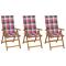 Chaises pliables de jardin lot de 3 avec coussins Bois d'acaciaCet ensemble de chaises de jardin en bois avec coussins est conçu pour ajouter un look vintage à tout dîner dans votre jardin, sur votre terrasse ou patio. La chaise pliable est en bois d'acacia massif, un bois dur tropical, ce qui la rend stable et durable. La surface à finition à huile est facile à nettoyer avec un chiffon humide. La chaise de salle à manger peut être ajustée en 5 positions, vous offrant un confort d'assise optimal. Elle peut également être pliée pour économiser de l'espace lorsqu'elle n'est pas utilisée. De plus, les coussins fournis offrent un confort supplémentaire lors de la détente ou du dîner. Chaque coussin comporte deux jeux de cordes des deux côtés et une sangle élastique derrière le dossier pour le fixer fermement à la chaise. La livraison comprend le matériel jaune galvanisé. Maximum 110 kg par siège. ,