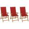 Chaises pliables de jardin lot de 3 avec coussins Bois d'acaciaCet ensemble de chaises de jardin en bois avec coussins est conçu pour ajouter un look vintage à tout dîner dans votre jardin, sur votre terrasse ou patio. La chaise pliable est en bois d'acacia massif, un bois dur tropical, ce qui la rend stable et durable. La surface à finition à huile est facile à nettoyer avec un chiffon humide. La chaise de salle à manger peut être ajustée en 5 positions, vous offrant un confort d'assise optimal. Elle peut également être pliée pour économiser de l'espace lorsqu'elle n'est pas utilisée. De plus, les coussins fournis offrent un confort supplémentaire lors de la détente ou du dîner. Chaque coussin comporte deux jeux de cordes des deux côtés et une sangle élastique derrière le dossier pour le fixer fermement à la chaise. La livraison comprend le matériel jaune galvanisé. Maximum 110 kg par siège. ,