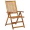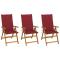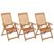Chaises pliables de jardin lot de 3 avec coussins Bois d'acaciaCet ensemble de chaises de jardin en bois avec coussins est conçu pour ajouter un look vintage à tout dîner dans votre jardin, sur votre terrasse ou patio. La chaise pliable est en bois d'acacia massif, un bois dur tropical, ce qui la rend stable et durable. La surface à finition à huile est facile à nettoyer avec un chiffon humide. La chaise de salle à manger peut être ajustée en 5 positions, vous offrant un confort d'assise optimal. Elle peut également être pliée pour économiser de l'espace lorsqu'elle n'est pas utilisée. De plus, les coussins fournis offrent un confort supplémentaire lors de la détente ou du dîner. Chaque coussin comporte deux jeux de cordes des deux côtés et une sangle élastique derrière le dossier pour le fixer fermement à la chaise. La livraison comprend le matériel jaune galvanisé. Maximum 110 kg par siège. ,
