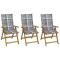 Chaises pliables de jardin lot de 3 avec coussins Bois d'acaciaCet ensemble de chaises de jardin en bois avec coussins est conçu pour ajouter un look vintage à tout dîner dans votre jardin, sur votre terrasse ou patio. La chaise pliable est en bois d'acacia massif, un bois dur tropical, ce qui la rend stable et durable. La surface à finition à huile est facile à nettoyer avec un chiffon humide. La chaise de salle à manger peut être ajustée en 5 positions, vous offrant un confort d'assise optimal. Elle peut également être pliée pour économiser de l'espace lorsqu'elle n'est pas utilisée. De plus, les coussins fournis offrent un confort supplémentaire lors de la détente ou du dîner. Chaque coussin comporte deux jeux de cordes des deux côtés et une sangle élastique derrière le dossier pour le fixer fermement à la chaise. La livraison comprend le matériel jaune galvanisé. Maximum 110 kg par siège.