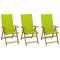Chaises pliables de jardin lot de 3 avec coussins Bois d'acaciaCet ensemble de chaises de jardin en bois avec coussins est conçu pour ajouter un look vintage à tout dîner dans votre jardin, sur votre terrasse ou patio. La chaise pliable est en bois d'acacia massif, un bois dur tropical, ce qui la rend stable et durable. La surface à finition à huile est facile à nettoyer avec un chiffon humide. La chaise de salle à manger peut être ajustée en 5 positions, vous offrant un confort d'assise optimal. Elle peut également être pliée pour économiser de l'espace lorsqu'elle n'est pas utilisée. De plus, les coussins fournis offrent un confort supplémentaire lors de la détente ou du dîner. Chaque coussin comporte deux jeux de cordes des deux côtés et une sangle élastique derrière le dossier pour le fixer fermement à la chaise. La livraison comprend le matériel jaune galvanisé. Maximum 110 kg par siège.