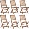 Chaises pliables de jardin lot de 6 avec coussins Bois d'acaciaCes chaises pliables en bois d'acacia massif avec coussins sont un endroit idéal pour vous détendre et profiter du soleil dans le jardin ou sur le patio. Ces chaises de jardin sont fabriquées en bois d'acacia massif, ce qui les rend solides et stables. Le bois d'acacia massif a la force de soutenir le poids et résiste à l'usure du temps. Ainsi, ces chaises d'extérieur offrent des années de détente. De plus, les chaises peuvent être pliées pour économiser de l'espace lorsqu'elles ne sont pas utilisées. Les coussins inclus ajoutent un confort supplémentaire. Chaque coussin comporte deux ensembles de cordes pour le fixer solidement sur la chaise. Remarque : Afin de prolonger la durée de vie de vos meubles d'extérieur, nous vous recommandons de les nettoyer régulièrement et de ne pas les laisser à l'extérieur sans protection inutilement.Nettoyage : Utiliser une solution savonneuse douceStockage : Si possible, stockez dans un endroit frais et sec à l'intérieur. Si le produit est stocké à l'extérieur, protégez-le avec une housse imperméable. Essuyez et séchez l'excès d'eau ou de neige des surfaces planes après la pluie ou une chute de neige. Permettez une circulation d'air suffisante afin d'éviter les dommages liés à l'humidité. Maximum 110 kg par siège.