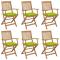 Chaises pliables de jardin lot de 6 avec coussins Bois d'acaciaCes chaises pliables en bois d'acacia massif avec coussins sont un endroit idéal pour vous détendre et profiter du soleil dans le jardin ou sur le patio. Ces chaises de jardin sont fabriquées en bois d'acacia massif, ce qui les rend solides et stables. Le bois d'acacia massif a la force de soutenir le poids et résiste à l'usure du temps. Ainsi, ces chaises d'extérieur offrent des années de détente. De plus, les chaises peuvent être pliées pour économiser de l'espace lorsqu'elles ne sont pas utilisées. Les coussins inclus ajoutent un confort supplémentaire. Chaque coussin comporte deux ensembles de cordes pour le fixer solidement sur la chaise. Remarque : Afin de prolonger la durée de vie de vos meubles d'extérieur, nous vous recommandons de les nettoyer régulièrement et de ne pas les laisser à l'extérieur sans protection inutilement.Nettoyage : Utiliser une solution savonneuse douceStockage : Si possible, stockez dans un endroit frais et sec à l'intérieur. Si le produit est stocké à l'extérieur, protégez-le avec une housse imperméable. Essuyez et séchez l'excès d'eau ou de neige des surfaces planes après la pluie ou une chute de neige. Permettez une circulation d'air suffisante afin d'éviter les dommages liés à l'humidité. Maximum 110 kg par siège.