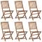 Chaises pliables de jardin lot de 6 avec coussins Bois d'acaciaCes chaises pliables en bois d'acacia massif avec coussins sont un endroit idéal pour vous détendre et profiter du soleil dans le jardin ou sur le patio. Ces chaises de jardin sont fabriquées en bois d'acacia massif, ce qui les rend solides et stables. Le bois d'acacia massif a la force de soutenir le poids et résiste à l'usure du temps. Ainsi, ces chaises d'extérieur offrent des années de détente. De plus, les chaises peuvent être pliées pour économiser de l'espace lorsqu'elles ne sont pas utilisées. Les coussins inclus ajoutent un confort supplémentaire. Chaque coussin comporte deux ensembles de cordes pour le fixer solidement sur la chaise. Remarque : Afin de prolonger la durée de vie de vos meubles d'extérieur, nous vous recommandons de les nettoyer régulièrement et de ne pas les laisser à l'extérieur sans protection inutilement. Nettoyage : Utiliser une solution savonneuse douce Stockage : Si possible, stockez dans un endroit frais et sec à l'intérieur. Si le produit est stocké à l'extérieur, protégez-le avec une housse imperméable. Essuyez et séchez l'excès d'eau ou de neige des surfaces planes après la pluie ou une chute de neige. Permettez une circulation d'air suffisante afin d'éviter les dommages liés à l'humidité. Maximum 110 kg par siège.
