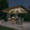 Chapiteau avec guirlande lumineuse à LED 3x3 m TaupeCe chapiteau sera idéal pour tous les événements en plein air, comme les petits réunions, les mariages, les fêtes barbecue, le camping et ainsi de suite. Vous pouvez également l'installer dans votre cour comme un large et joli parasol de repos pour votre famille et vos invités. Le cadre est fort et stable grâce à sa construction tout en acier et l'auvent du toit est en 100 % polyester qui a reçu un revêtement en polyamide pour vous protéger des rayons UV nocifs et de la pluie. Son design élégant à double ventilation permet également une meilleure circulation de l'air et un confort accru. De plus, la guirlande lumineuse crée une ambiance chaleureuse dans votre jardin lorsque le soleil se couche. Les lumières n'apportent aucune pollution à l'environnement car elles sont chargées par l'énergie solaire pendant la journée. REMARQUE : ce produit ne doit JAMAIS être utilisé par mauvais temps, tel que vent fort, pluie abondante, neige, tempête, etc. Ce produit ne doit pas être éliminé avec les autres déchets ménagers dans l'Union européenne.Tenez les enfants et les animaux domestiques à l'écart de la zone d'assemblage jusqu'à ce que le travail soit terminé. Certaines pièces peuvent présenter des arêtes vives, portez des gants de protection si nécessaire. Le gazebo doit être positionné et fixé uniquement sur une surface plane et horizontale. N'essayez pas d'assembler le gazebo dans des conditions venteuses ou humides. Ne placez pas votre gazebo dans une zone exposée à un vent excessif. Si vous utilisez des outils électriques ou une échelle, suivez toujours les instructions de sécurité du fabricant pour éviter les blessures. NE PAS utiliser de flammes nues dans le gazebo ou à proximité du pavillon. Les objets chauds tels que les grils récemment utilisés, les chalumeaux, etc. ne doivent pas être entreposés dans le pavillon de jardin. Fixez le gazebo à l'aide des piquets fournis.