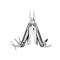 Outils auto-bloquants. Livrée avec 8 embouts réversibles. Pinces à bec effilé + Pinces normales + Coupe fil dur + Coupe fil + Pinces à sertir + Dénudeur de fil + Couteau S30V + Couteau cranté HC420 + Scie + Ciseaux + Crochets coupe sangle + Règle (19cm) + Ouvre-boîtes + Décapsuleur + Lime boismétal + Lime diamantée + Adaptateur grand embout + Adaptateur petit embout + Tournevis plat moyen