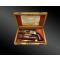 Coffret d’origine en noyer, vissé et plaque de laiton sur le dessus. Verrouillage par crochés pivotants ; serrure avec sa clé. L’intérieur est garni de feutre rouge, avec sous le couvercle la notice appliquée.