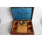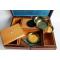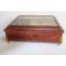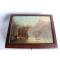 Coffret a jeux musical Samuel Troll Art populaire Suisse bois gainé de cuir brun couvercle orné d'une peinture a l'huile (bord Lac Léman) sur quatre pieds en laiton d'époque XIXe siècle coffret en bon état le mécanisme de la musique est complet et en bon état, seul le ressort est cassé empêchant donc l'entraînement du cylindre