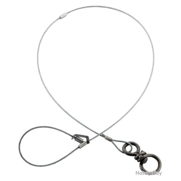 Câble acier, passant autobloquant, butées maxi et mini, émerillon acier anti-noeuds.