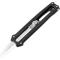 Une lame en acier D2 de forme Drop Point, satinée et lisse. Ouverture avec un bouton sort vers le haut ou vers le bas, une détente à mi-course augmente la sécurité du travail.