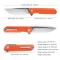 Couteau EDC Bestech Bestechman Dundee Orange D2 Blade G10 Handle IKBS Linerlock Clip pliant - Longueur ouvert 20.50cm - Longueur fermé 12cm - Longueur de lame 8.5cm - Epaisseur de lame 3.2mm - Lame de type drop point plain edge finition 2 tons - Lame en acier D2 - Dureté 59-61HRC - Lame montée sur pivot avec roulements à billes - Platines en acier - Plaquettes en Orange G10 - Ouverture d'une main avec le flipper - Système de sécurité linerlock - Clip de poche