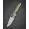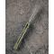 Le manche est composé de plaquettes en G10 OD Green (Vert Olive), un matériau composite ultra-résistant qui offre une texture antidérapante. La grande innovation de ce modèle est son mécanisme de verrouillage Button Lock, permettant une fermeture ultra-rapide et sécurisée d'une seule main sans jamais placer les doigts sur la trajectoire de la lame. L'ouverture est d'une fluidité déconcertante grâce au système de roulements à billes en céramique, activable via un Flipper ou un trou de pouce (Thumb Hole).