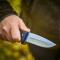 Le couteau Herbertz Black Panther est fabriqué d'une seule pièce en acier inoxydable AISI 420. Une garde imposante combinée à un repose pouce permettent un travail en toute sécurité. Les poignées résistantes en G10 sont munies de rivets couleur laiton. Un oeillet permet d'attacher une lanière de sécurité. Ce couteau robuste est livré dans un étui en cuir noir.