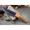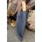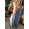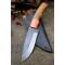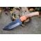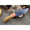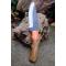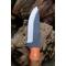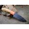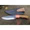 Couteau de chasse Skinner Survie à lame fixe - Longueur totale 245cm - Longueur de lame 13cm - Lame en acier carbone 1075 demi brut de forge - Lame type drop point plain edge finition 2 tons - Construction d'une seule pièce - Full tang - Plaquettes du manche en bois - Mitres en bois - Etui similicuir - Fabrication artisanale