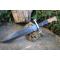 Couteau Bowie Chasseur d'Ours à lame fixe - Longueur totale 38cm - Longueur de lame 24.5cm - Largeur de lame 4cm - Lame en acier damas 256 couches - Lame clip point - Construction plate semelle - Garde en nickel - Manche en bois - Fabrication Artisanale - Etui cuir
