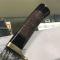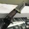 Longueur totale 30,48cm. Longueur de lame 18.42cm. Lame en acier damas 256 couches. Garde en laiton. Manche en corne de buffalo & rouleaux de cuir. Etui cuir noir.