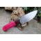 Couteau Damas Skinner 256 couches à lame fixe : Longueur totale 22.5cm. Longueur de lame 11.5cm. Lame en acier damas 256 couches. Lame construction plate semelle. Lame de type bowie. Plaquettes du manche en bois fushia. Mitres rosewood. Etui en cuir - Les dessins de la lame sont uniques comme une empreinte - Fabrication artisanale