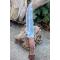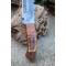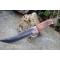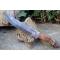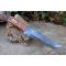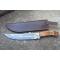 Couteau Bowie de Chasse à lame fixe - Longueur totale 29cm - Longueur de lame 18.5cm - Longueur du tranchant 16cm - Construction plate semelle - Lame en acier damas 256 couches - Lame clip point - Manche en 3 bois - Fabrication Artisanale - Etui cuir