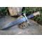Couteau Bowie dresseur de dragons à lame fixe - Longueur totale 38cm - Longueur de lame 24.5cm - Largeur de lame 4cm - Lame en acier damas 256 couches - Lame clip point - Dos en forme de dos de dragon - Construction plate semelle - Garde en nickel - Manche en bois - Fabrication Artisanale - Etui cuir