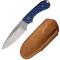 Le Bradford Guardian 3.2 est doté d'une lame de 8,89 cm de style Drop Point avec un faux tranchant, fabriquée en acier inoxydable AEB-L. Cet acier est réputé pour sa performance de coupe exceptionnelle, sa grande résistance à la corrosion et sa capacité à prendre un tranchant extrêmement fin, avec une dureté généralement optimisée entre 58 et 61 HRC. La finition stonewash de la lame lui confère un aspect discret et une durabilité accrue, tout en masquant les rayures. Le tranchant est lisse, garantissant des coupes nettes et précises. Le manche de 18,11 cm au total est en G10 texturé noir et bleu, offrant une prise en main ergonomique et sécurisée, même dans des conditions humides. Cette combinaison de couleurs offre un contraste moderne et attrayant. Sa construction en pleine soie étendue (full, extended tang) assure une solidité maximale, prolongeant la lame à travers tout le manche. Un trou pour cordon de sécurité est intégré pour une personnalisation ou un transport sécurisé. Le couteau est accompagné d'un étui en cuir marron de haute qualité avec passant de ceinture, permettant un port confortable et un accès rapide.