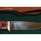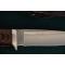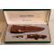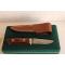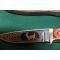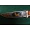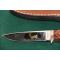 Lame de chasse à pointe tombante en acier inoxydable poli qui est gravée en spirale fantaisie et a une gravure de cerf en or.