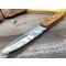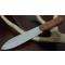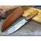 Le manche en bois burl brun, fixé par des rivets en laiton, apporte une touche classique et une bonne ergonomie. Le couteau est livré avec un étui en cuir marron pour un port pratique à la ceinture. Il combine authenticité et fonctionnalité.