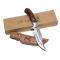 Couteau de Chasse Loisirs Outdoor Bushcraft fixe - Longueur totale 23.50 cm - Longueur de la lame 11 cm - Gouttières dans la lame - Lame en Acier 440 - Construit d'une seule pièce type plate semelle - Manche en bois - Garde en nickel - Etui de rangement en cuir