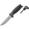Le manche est moulé par injection dans un composite gris foncé et noir, offrant une prise en main ergonomique et sécurisée, même dans des conditions humides. L'atout majeur de ce modèle est son allume-feu (fire starter) qui se range directement dans le manche, assurant qu'il soit toujours disponible.