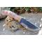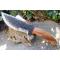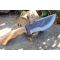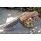Couteau Bushcraft Trakker à lame fixe - Longueur totale 26cm - Longueur de lame 14.5cm - largeur 5cm au + large - Lame en acier carbone 1055 martelée - Lame de type tanto trakker plain edge - Finition 2 tons - Construction d'une seule pièce - Full tang - Manche Bois ergonomique - Mitres en bois - Etui cuir - Fabrication artisanale