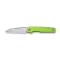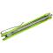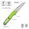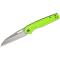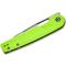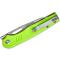 Le manche est en G10 vert fluorescent, un matériau composite durable et léger qui offre une prise en main solide et confortable, même dans des conditions humides. Le couteau est doté d'un mécanisme de verrouillage Liner Lock, qui assure un blocage sécurisé et fiable de la lame. L'ouverture de la lame se fait de manière incroyablement douce et rapide grâce à un pivot monté sur des roulements à billes en céramique, actionné par un flipper frontal et un trou pour le pouce.