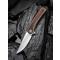 Le manche est le point fort de ce modèle, avec des plaquettes en Cuivre recouvertes d'une finition Noire Frottée à la Main (Black Hand Rubbed), qui développera une patine unique avec le temps. L'ouverture est assurée par l'ouverture flipper rapide et fiable, montée sur un pivot à Roulement à Billes en Céramique Cagée. Le mécanisme de verrouillage Liner Lock assure la sécurité de l'utilisateur.
