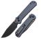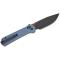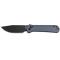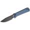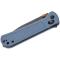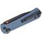 Le manche est composé de plaquettes en G10 gris (bleu), un matériau composite léger et durable qui offre une prise en main confortable et sécurisée. Le motif quadrillé fraisé sur le G10 assure une adhérence exceptionnelle dans toutes les conditions.