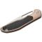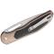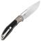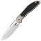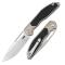 Le manche est en aluminium noir avec des incrustations en G10 noir, un design bicolore qui offre une prise en main solide et confortable. Le couteau est équipé d'un mécanisme de verrouillage Liner Lock, qui assure un blocage sécurisé de la lame. L'ouverture est facilitée par un trou de pouce et un pivot monté sur des roulements à billes en céramique, garantissant une action fluide et rapide. Un clip de poche en acier permet un transport discret.