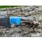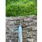 Sont réuni sur ce modèle une lame damas en acier carbone avec découpe EDM (électroérosion) inscrivant un symbole patrimonial français et un manche en corne de bélier muni d'une garde en manche colorée.