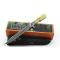 Petite qualité pour ce couteau "made in china",manche plastique imitation bois de cerf avec carabine winchester incrustée.